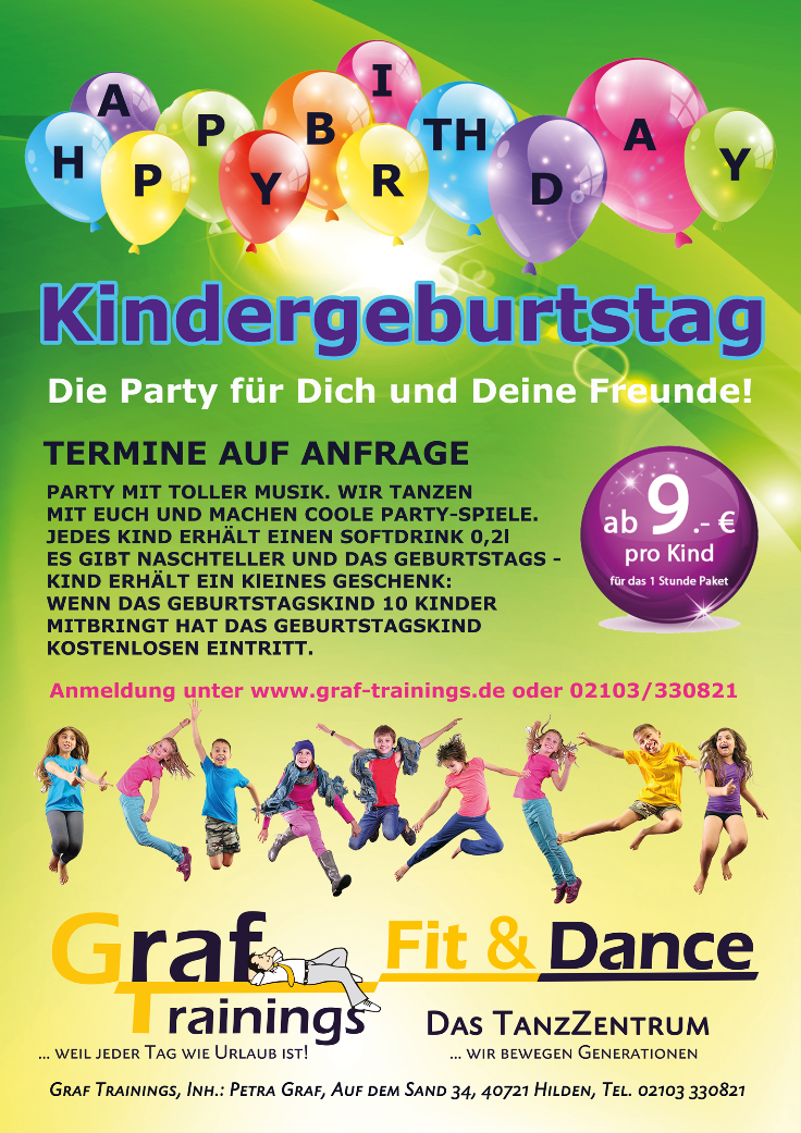 seit einigen Jahren führen wir erfolgreich Kindergeburtstags-Partys durch. Entweder Ihr kommt zu uns, oder wir kommen zu Euch. Alles ist möglich. Für weitere Informationen oder Terminanfragen erreichen Sie uns unter: 02103-330821 oder per E-Mail info@graf-trainings.de